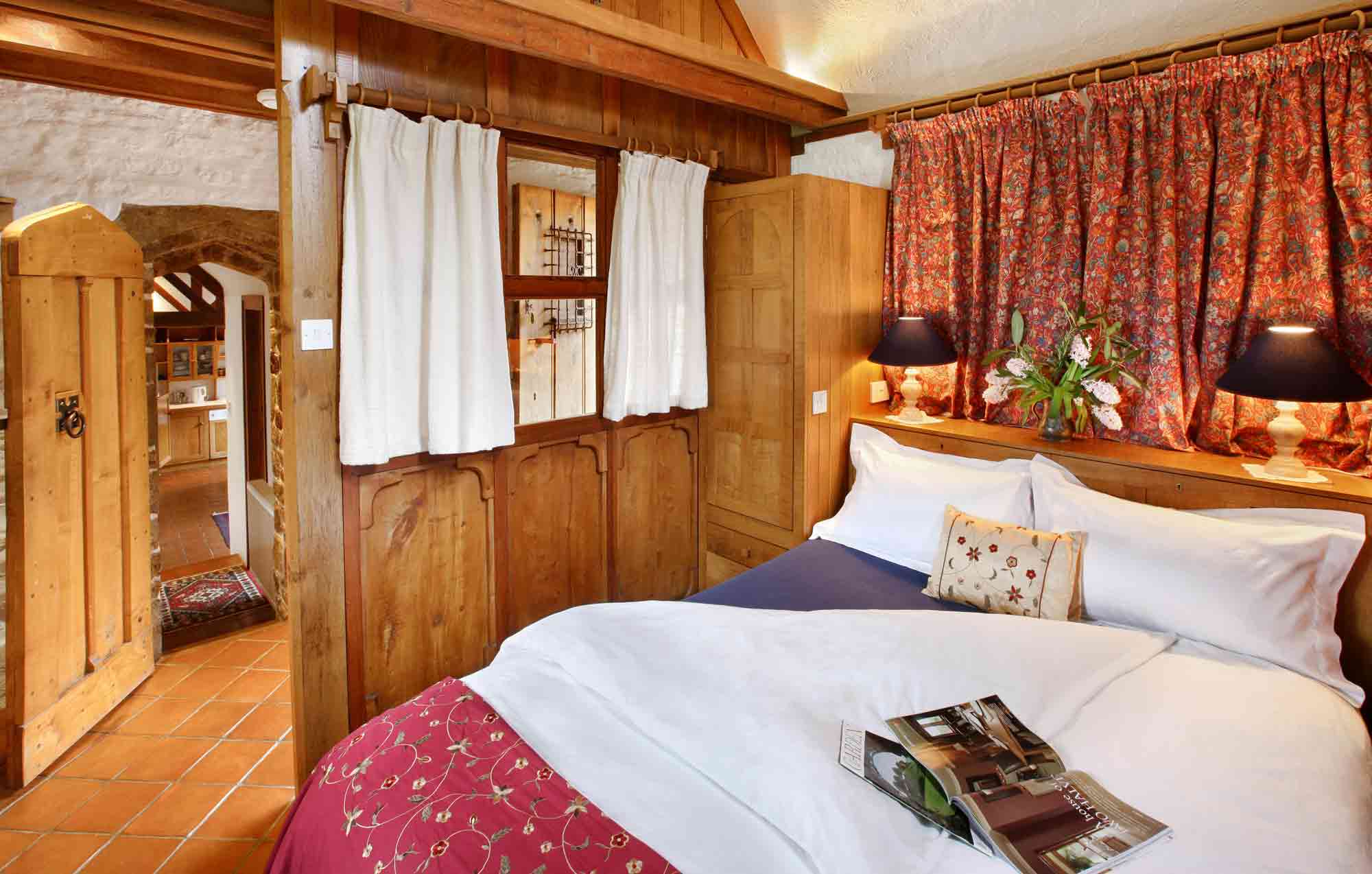Each room has its own unique and inviting character. Beneath the dovecote a weighty wooden door with wrought iron grille leads into the lobby. To the left is the bedroom with stone mullioned arched windows looking directly out onto the fields. A medieval styled arched door and stone passageway leads past an unusual Moroccan styled bathroom with spacious power shower down into the light and airy living area and open plan fully equipped kitchen with dining table and chairs.