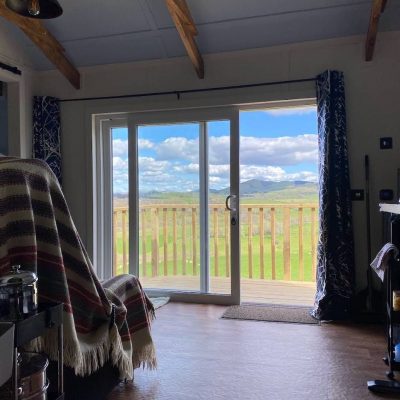 2 riser recliners sit in front of large sliding doors that lead to a wooden deck which looks over stunning mountain views. With a 6ft high fenced, secure garden area set within the 16 acre field in front of the shepherd hut, your doggy family members will also love exploring Dulas, and children have an open space to run around while still being close to the hut.