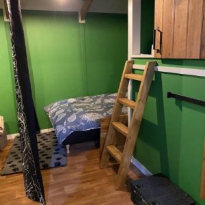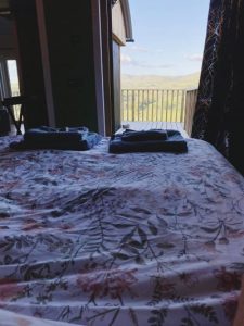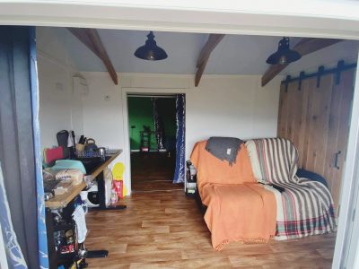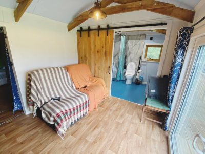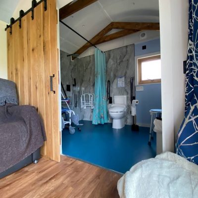 As Hafan Y Mynnydd is also an accessible holiday home, there are visible wires that are used to power the beds. The shepherds hut has blackout curtains to separate the different area of the hut which work really well over night. There are no internal doors with the exception of the sliding bathroom door.