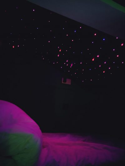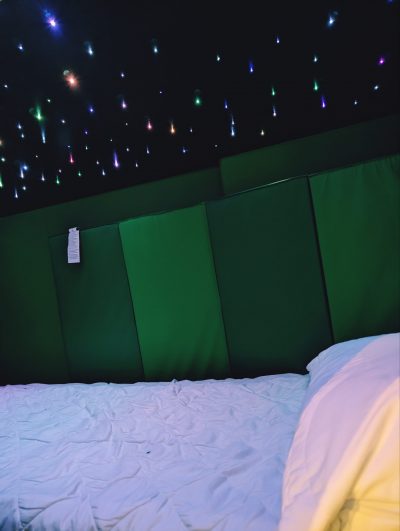 Our accessible spacious double shepherds hut sleeping upto 5 is open all year round. Our 2 unique sensory pods are a haven for young people who benefit from a calm space to regulate and when used with our Spectrum pack and the additional sensory equipment at Dulas,  are perfect for providing much needed sensory feedback. There is also a comfy kingsize, and single bed within the sleeping area meaning that larger families can also enjoy glamping at Hafan Y Mynnydd!