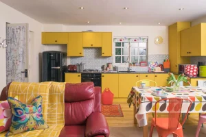 The kitchen/diner is as well equipped as home to ensure chores are kept to a minimum, funky yellow kitchen, electric cooker with gas hob, fridge freezer and dishwasher.