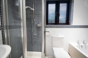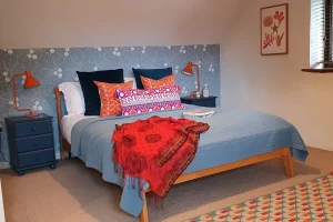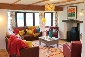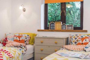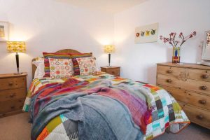 There’s a family bathroom with bath, wash basin, WC and separate shower on the ground floor, plus a large double bedroom and a twin bedroom with two 3ft single beds. Upstairs there are two huge bedrooms – a double room with king size bed and seating area and a twin, both with en-suite shower rooms and fabulous views over the valley.