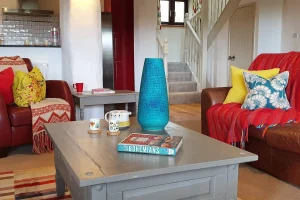 The living room has a stunning, unusual design with a large circular living room window to maximise the view and the light. Sink into the sumptuous leather sofas and demand a glass of wine…or two!