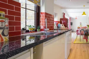 The stylish oyster gloss kitchen is complemented by red Fired Earth tiles, electric oven with ceramic hob and a large modern Retro fridge freezer. The lounge is bright and cheerful with wonderful views over the orchard through the glass sliding doors and a lovely balcony deck with patio furniture to enjoy a cheeky glass of fizz