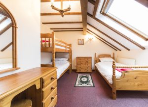 Triple bedroom with a set of full size bunk beds and a full size single bed, dressing table, chest of drawers, fitted wardrobe.