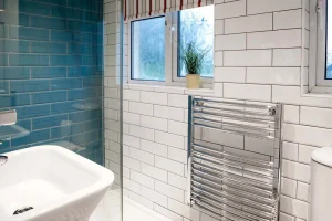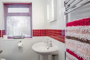 There are three bedrooms, one king size with en-suite double shower, and two more pretty twin bedrooms (both with 3ft single beds) which share a bathroom with wc, basin and bath with shower over.