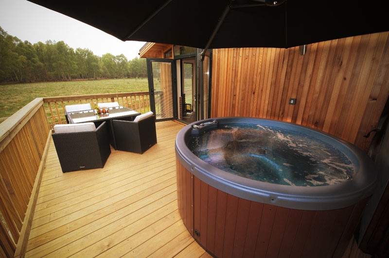 Outside, there’s a decked terrace with seating and a private hot tub where you can bathe away the stresses of daily life.